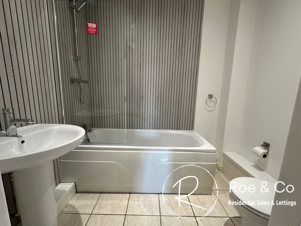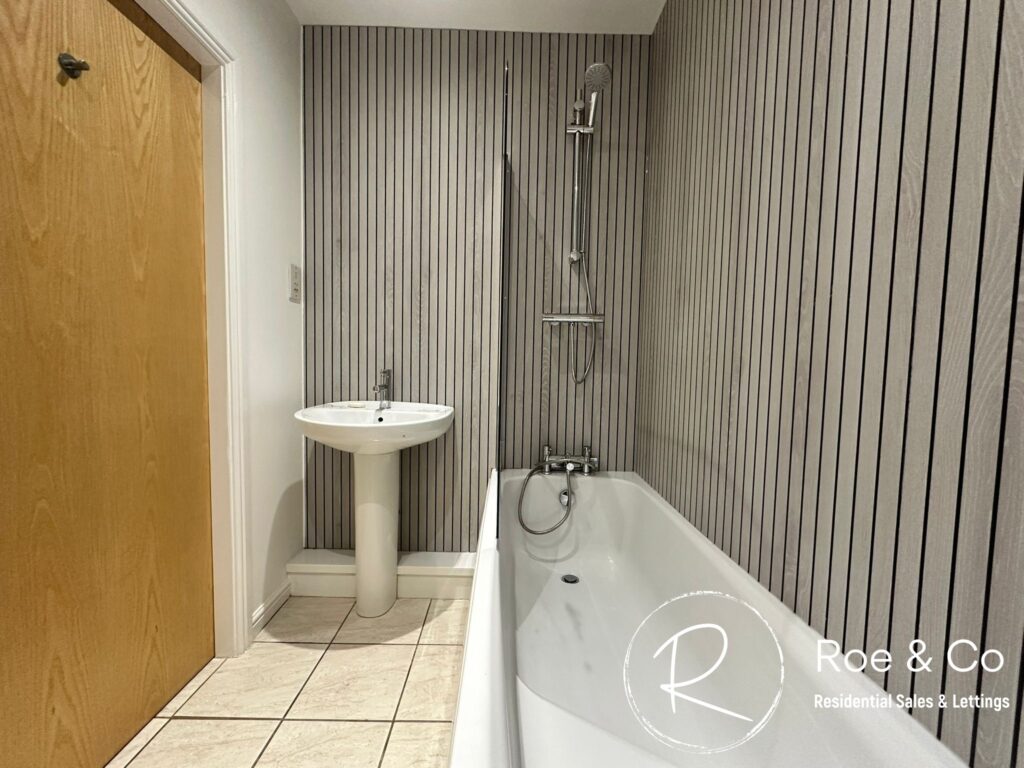 Inside, the décor is neutral throughout, serving as a blank canvas for your personal style. The main reception room is bright and versatile, ideal for both relaxing and entertaining. Each bedroom is well-lit and spacious, offering ample scope for customisation. The bathrooms are a true highlight, with contemporary fixtures and elegant finishes. Enjoy the luxury of a modern walk-in shower with glass doors, stylish vertical panelling, and a full-size bath-tub complemented by a sleek pedestal sink. Frosted windows in the bathrooms provide natural light and privacy, while unique striped wall designs add a touch of individuality. Ample electrical outlets in the principal rooms make the space practical for modern living, whether working from home or unwinding after a long day.