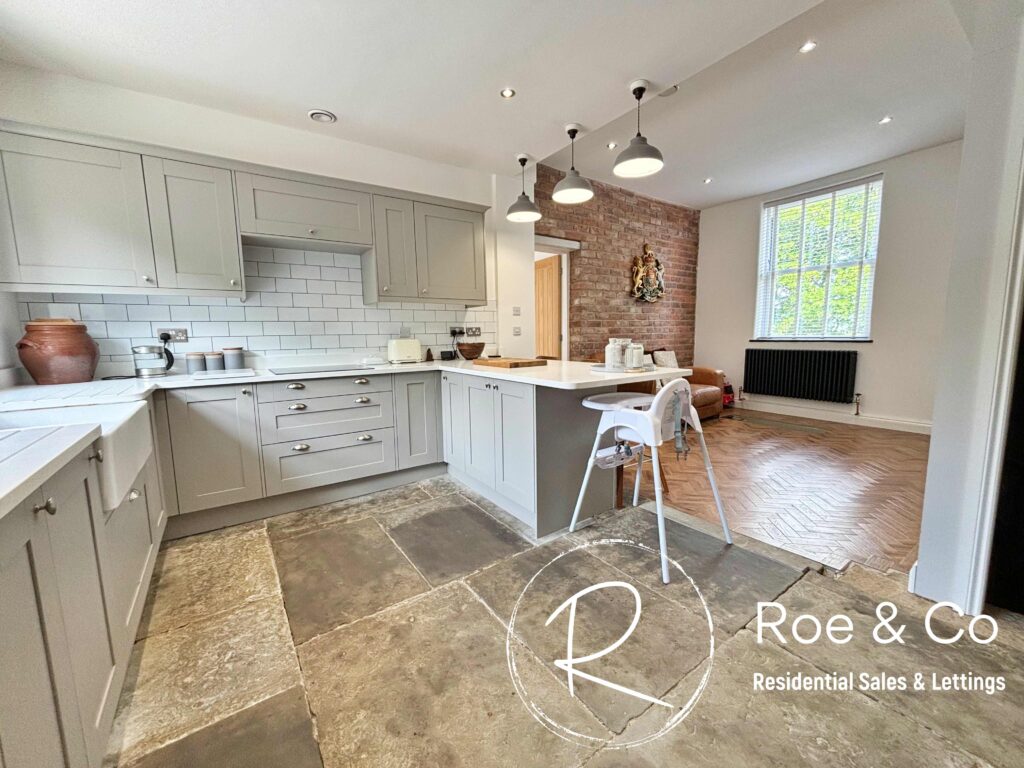 Fitted kitchen, with integrated fridge/freezer, oven & microwave, electric induction hob & extractor fan. Stairs which lead to the cellar. Original flagged flooring to the kitchen area.
