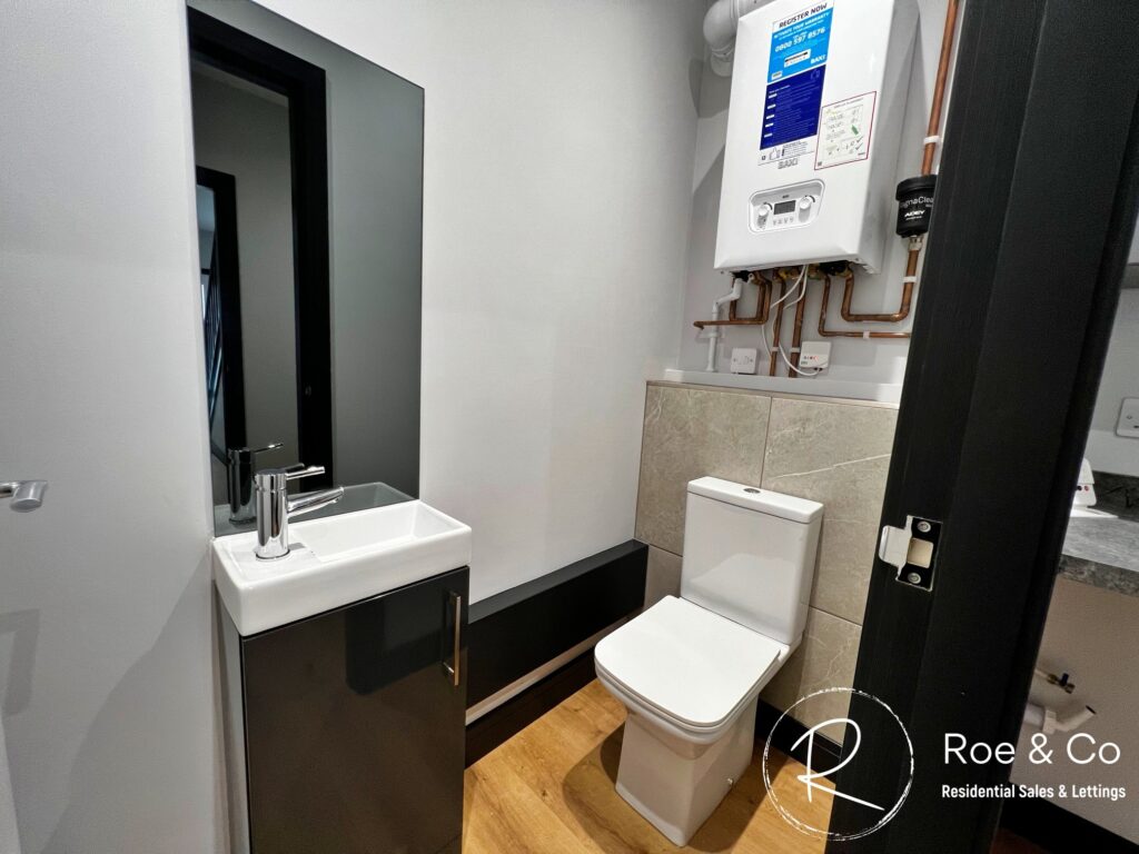 The property includes a separate utility room with plumbing, a convenient downstairs WC, and a family bathroom offering both a separate bath and shower. The landscaped rear garden provides a safe and inviting outdoor space for children to play, while the front driveway accommodates parking for 3 to 4 cars.