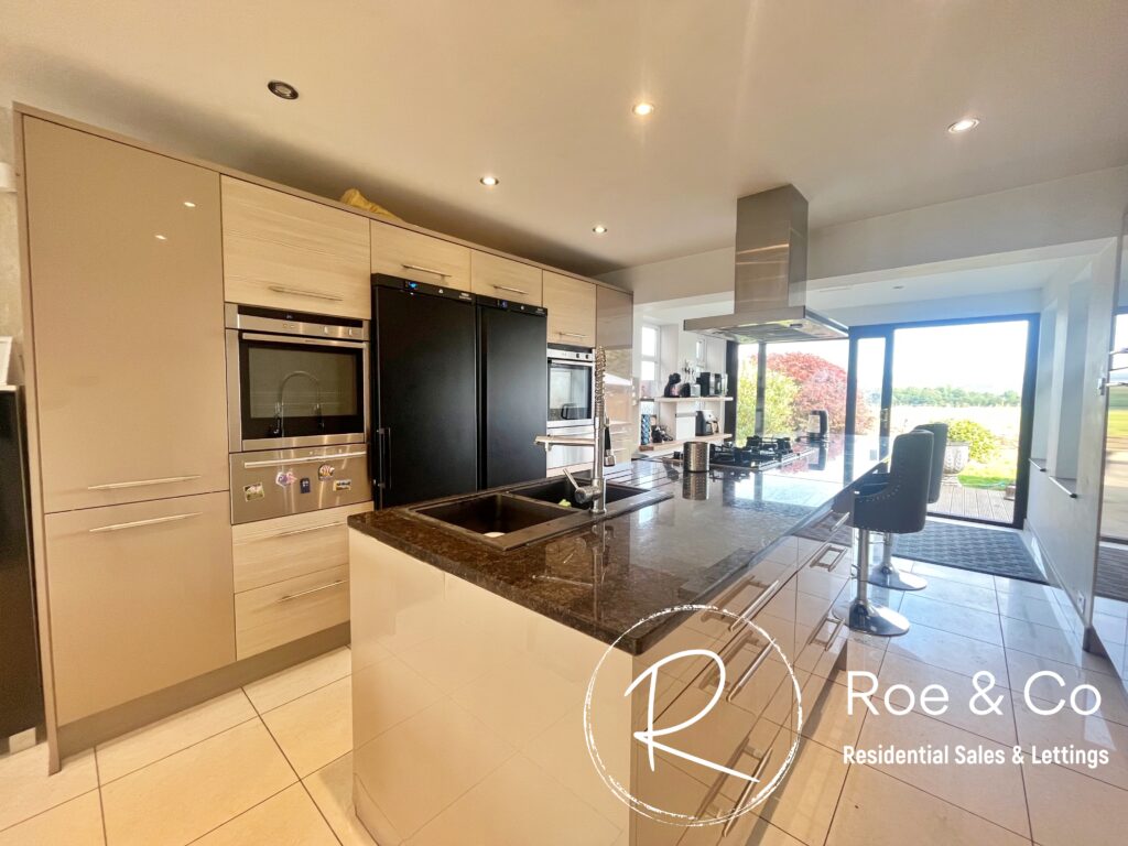 A modern high gloss kitchen which has been fitted with a range of wall and base units with complimentary granite work surfaces and breakfast bar. Composite double sink a with mixer tap and spray attachment. There are a range of integrated appliances to include; three domino Neff gas hob units with stainless steel extractor hood, dishwasher, two Neff ovens with slide away doors, two warming drawers and wine cooler. Patio doors which open onto the rear garden taking in the amazing views to the rear.
