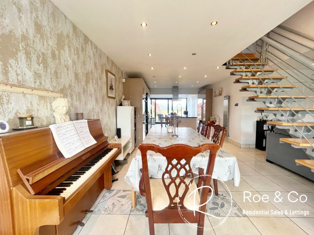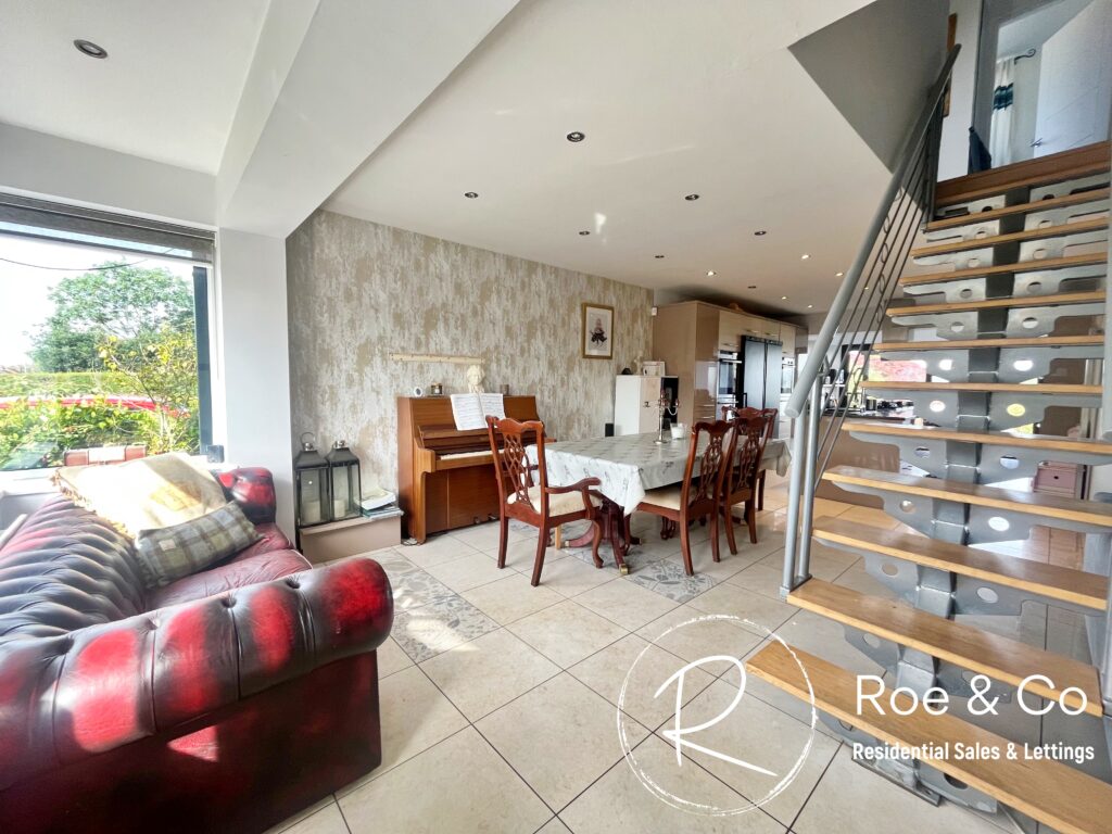 Again due to the flexibility of the ground floor, this area could be used as the lounge area backing onto the kitchen, however the current owners felt it flowed better having the dining area off the kitchen. There is a feature staircase which really takes centre stage within this room.