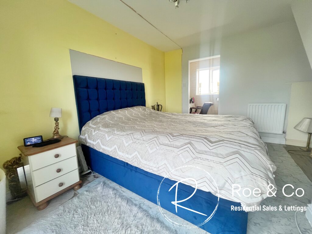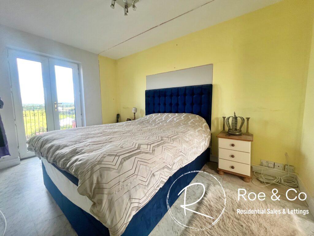 Previously the bedroom had fitted wardrobes which have been removed, however there is the option to have custom made wardrobes under the staircase which leads to the top floor. You'll find double doors which open onto the balcony which benefits from the views to the rear, perfect to relax on of an evening.