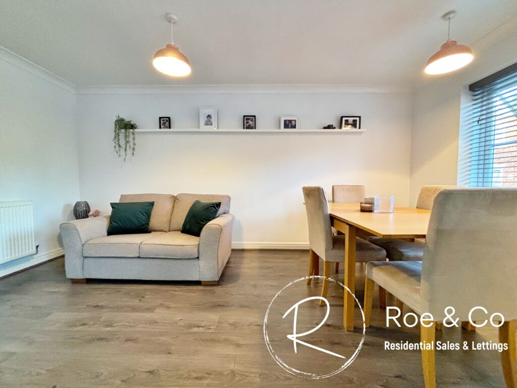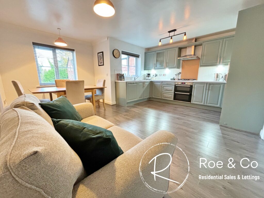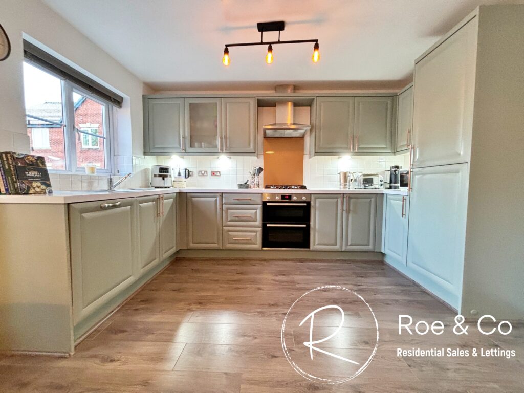 A modern fitted kitchen with integrated dishwasher, fridge/freezer, double oven, hob & extractor fan. Space for a dining table & living area. A perfect family room.