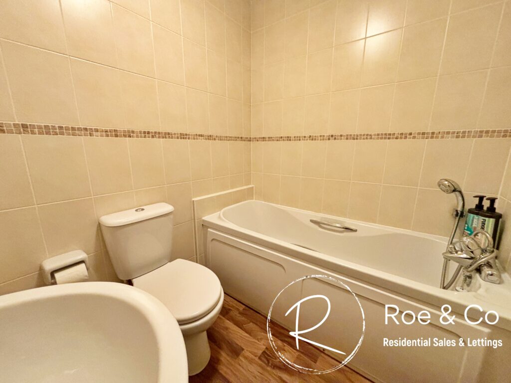 Three piece white bathroom suite. Located on the first floor.