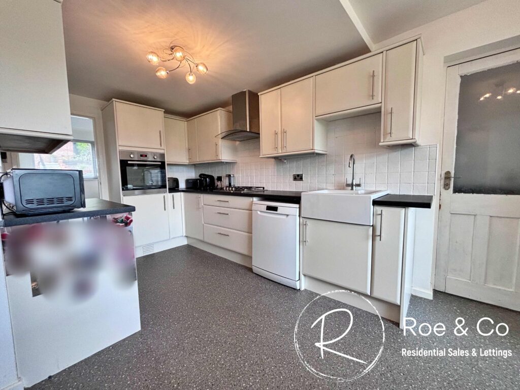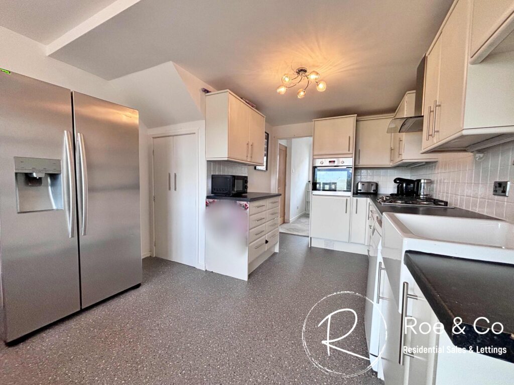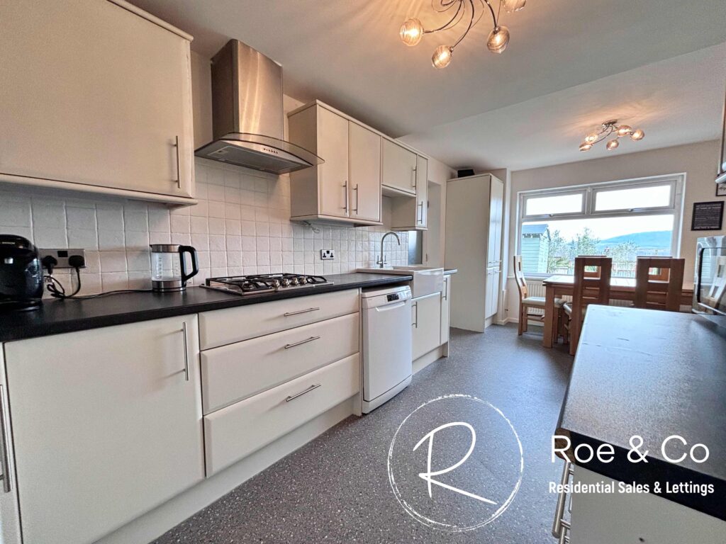 Fully fitted kitchen with five gas hob, integrated oven, space for dishwasher and washing machine.