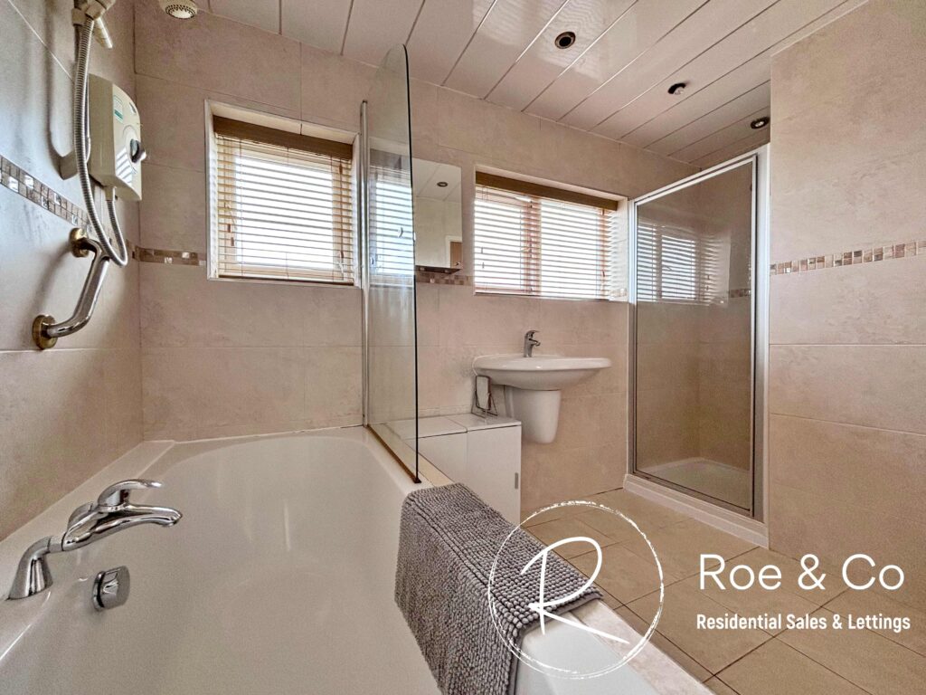 Four piece bathroom suite, with bath, walk in shower, W.C. & sink.