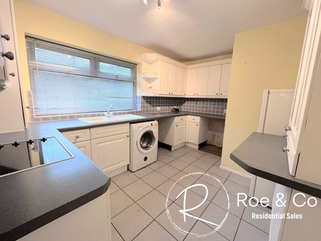 Fitted with a range of modern white base and wall units with matching drawers, wine rack, display units, 1+1/2 bowl sink unit with single drainer, mixer tap. Built-in electric oven, four ring hob with pull out extractor hood over. Space for washing machine, fridge/freezer, dishwasher and dryer.
