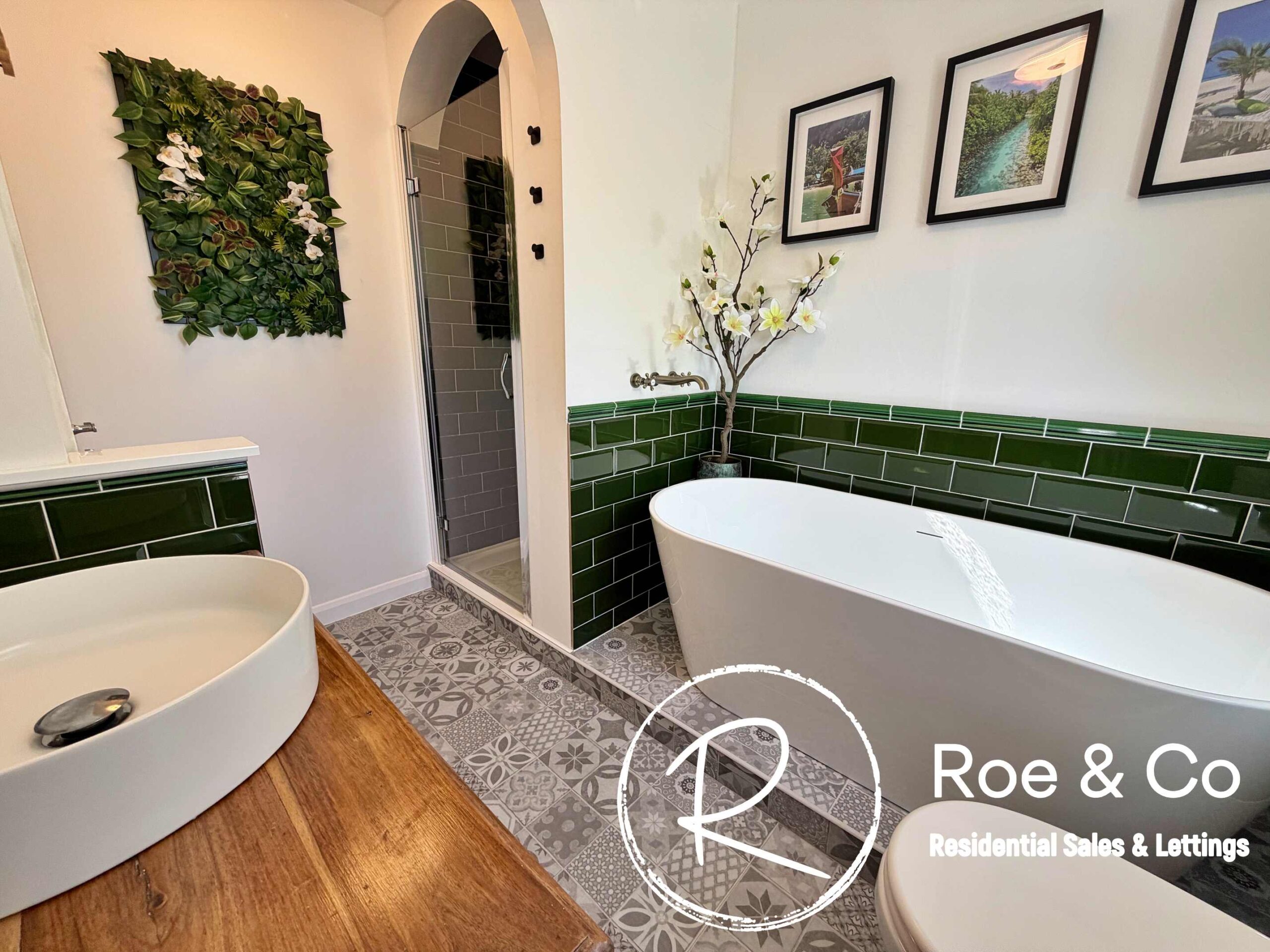 Three piece bathroom suite, with overhead shower to the bath,W.C. & floating sink above the vanity unit.