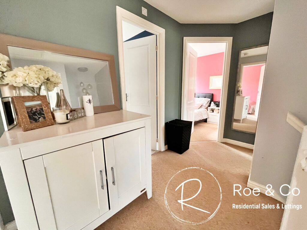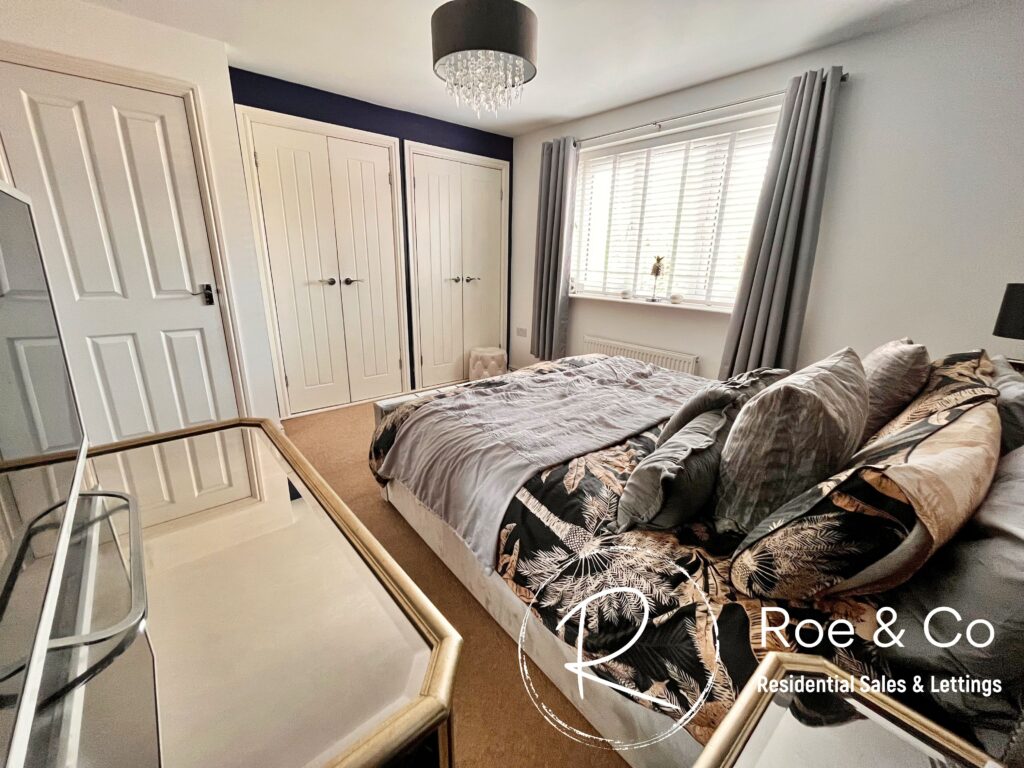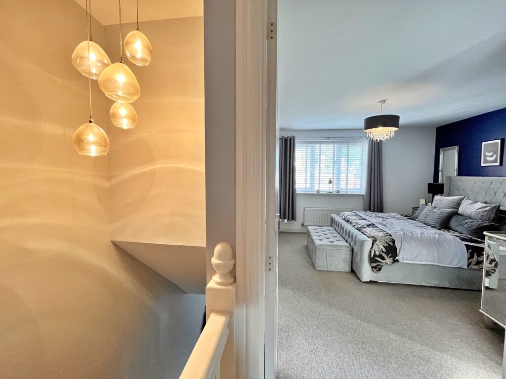 Fitted with built in wardrobes with two sets of doors, railing and storage space and overhead stair cupboard with shelving for shoe and bag storage.