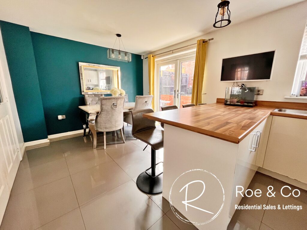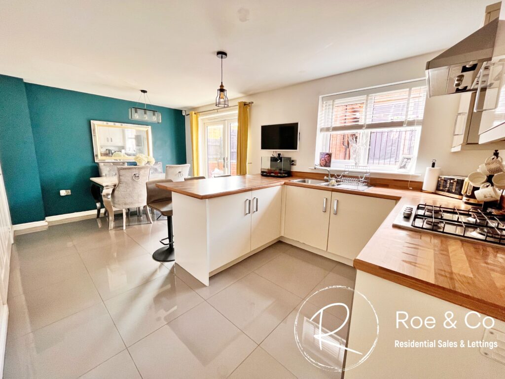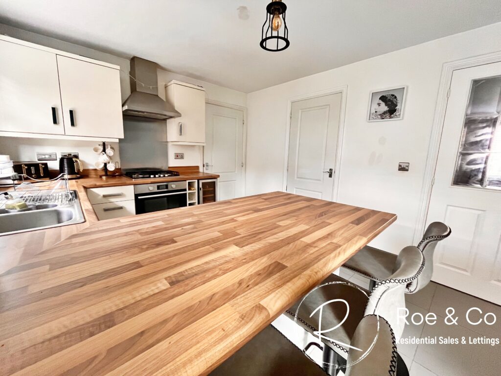 Fully fitted modern high gloss cream kitchen with integrated oven, hob and vent and breakfast bar which accommodates four stools. Access to the under stair storage cupboard