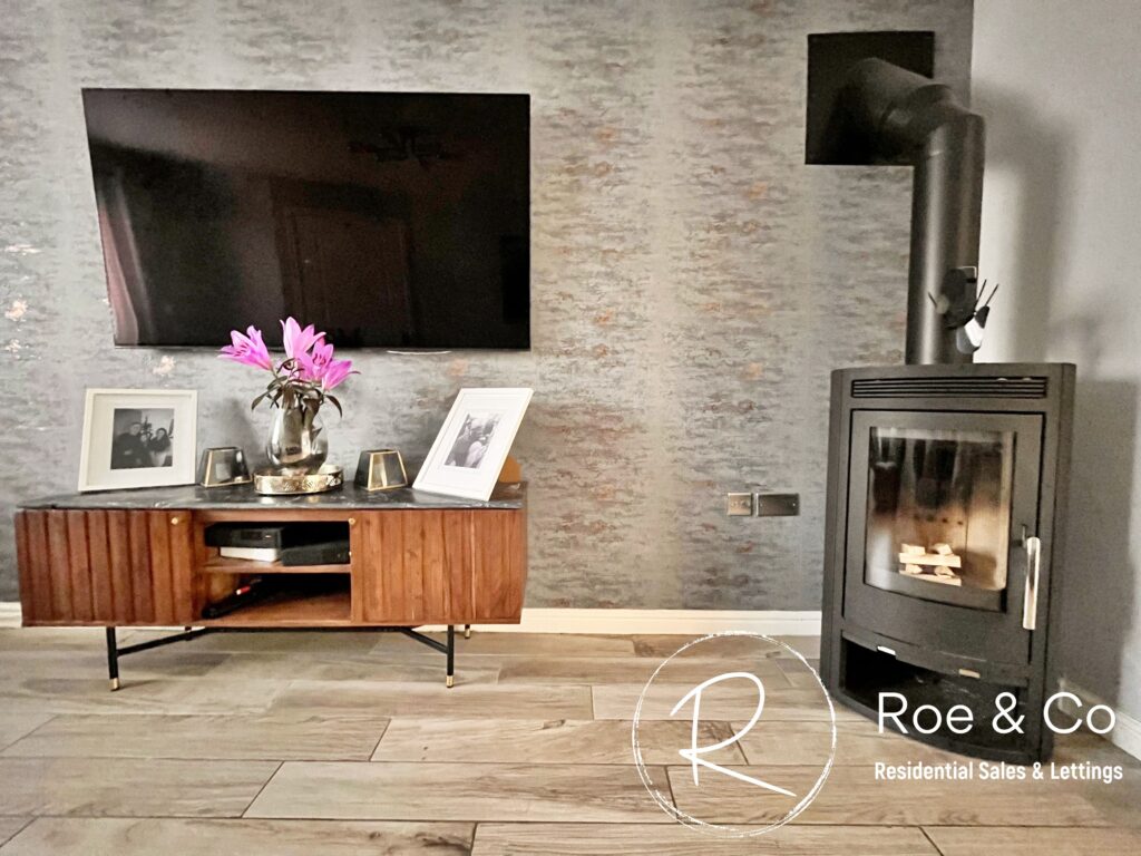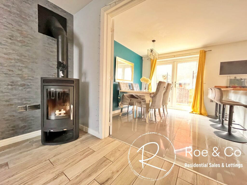 Log burner fitted professionally in 2021 double doors with glass to let in natural light leading onto the kitchen/diner
