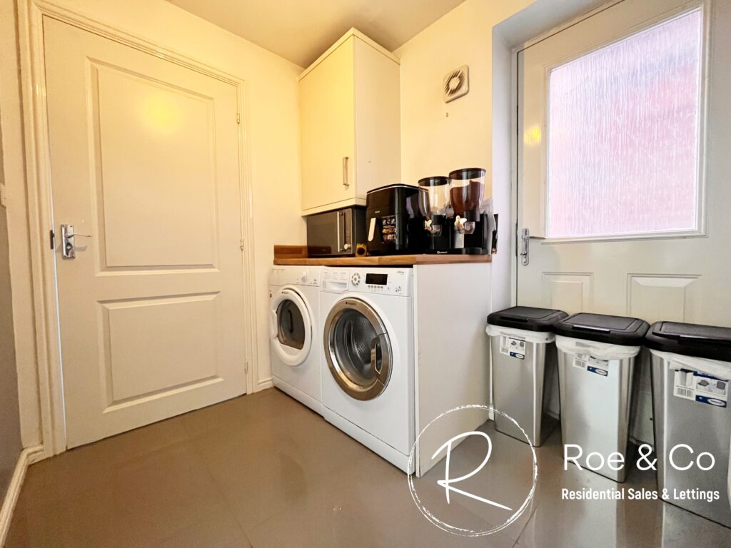 Worktop and space for a washing machine and dryer. Housing the boiler and providing access to the second utility room and the downstairs W.C.