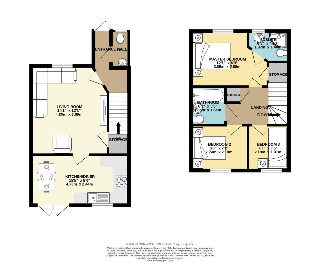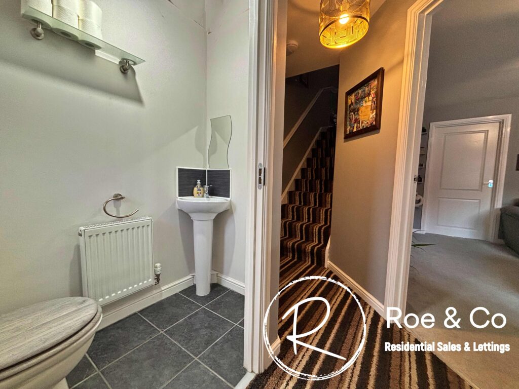 Upon entering the property, you are greeted by a welcoming entrance hall with a downstairs W.C. leading to the living room. The modern kitchen is equipped with integrated appliances and a breakfast bar. Upstairs, there are three bedrooms, with the master bedroom benefiting from the luxury of an en-suite bathroom.