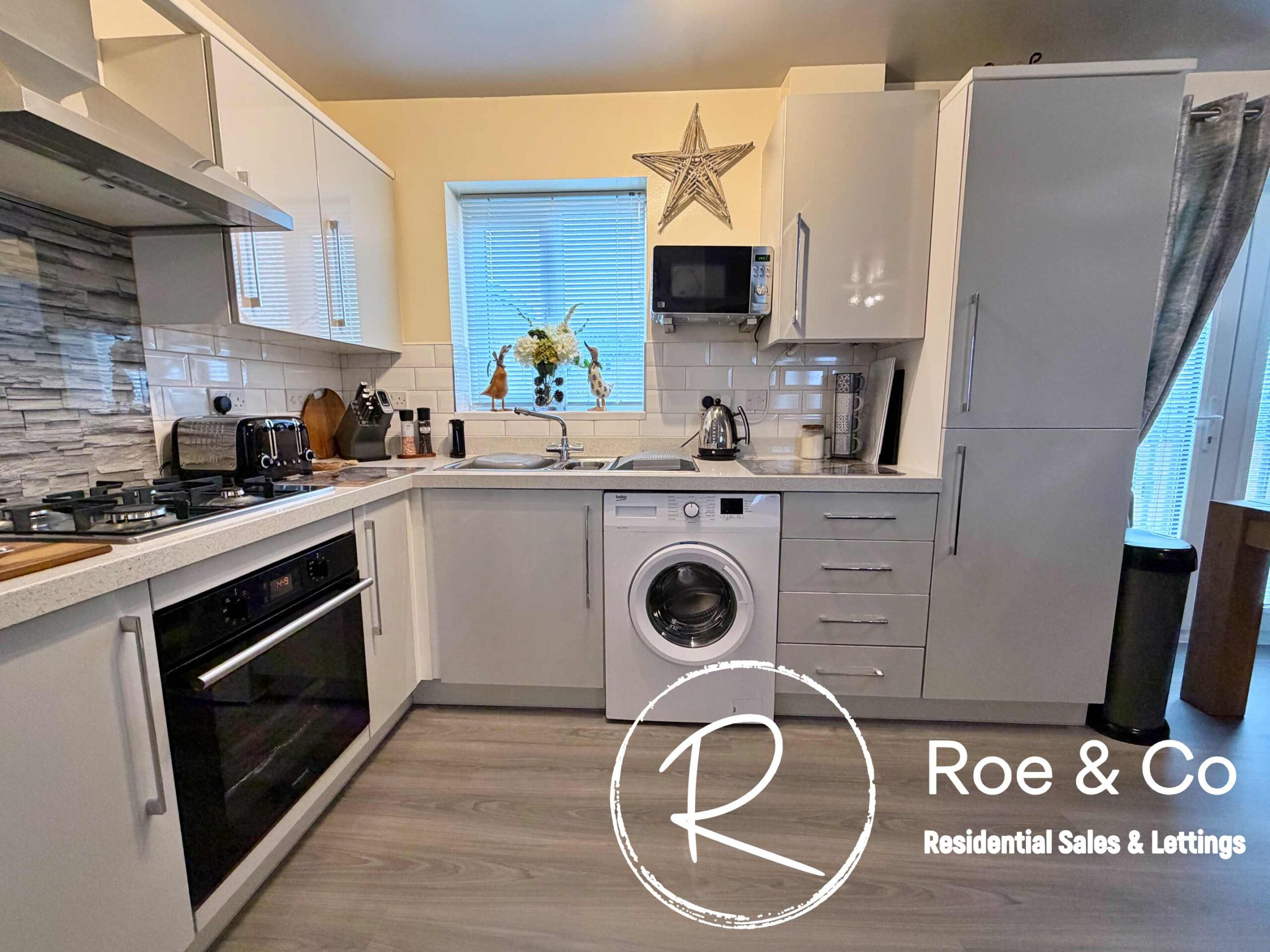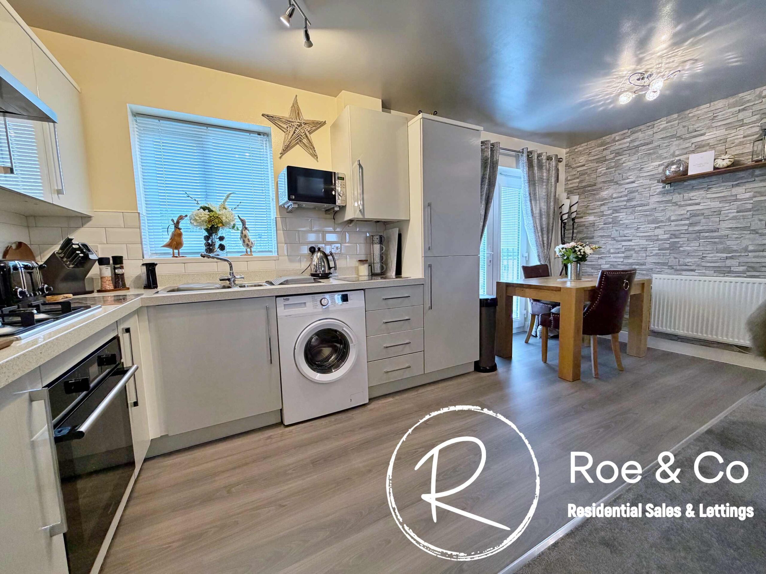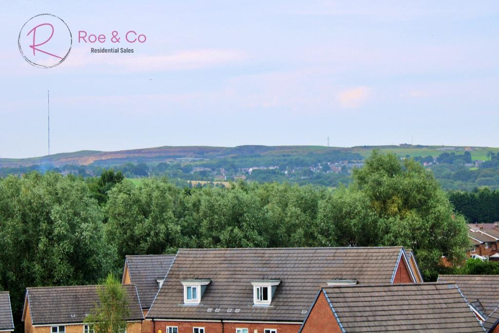 The spacious open-plan living and dining area enjoys an abundance of natural light, with a Juliette balcony offering delightful views over Harrier Close and towards Rivington. The modern fitted kitchen is seamlessly integrated into the living space and comes complete with contemporary units, integrated appliances, and plenty of worktop space for meal preparation. The stylish bathroom is finished to a high standard, including a full-sized bath with shower over, a wash basin, and WC. Also benefitting from a large storage cupboard within the entrance hallway which offers a great place to house a dryer, with hanging space for clothes and further storage for ironing boards etc.