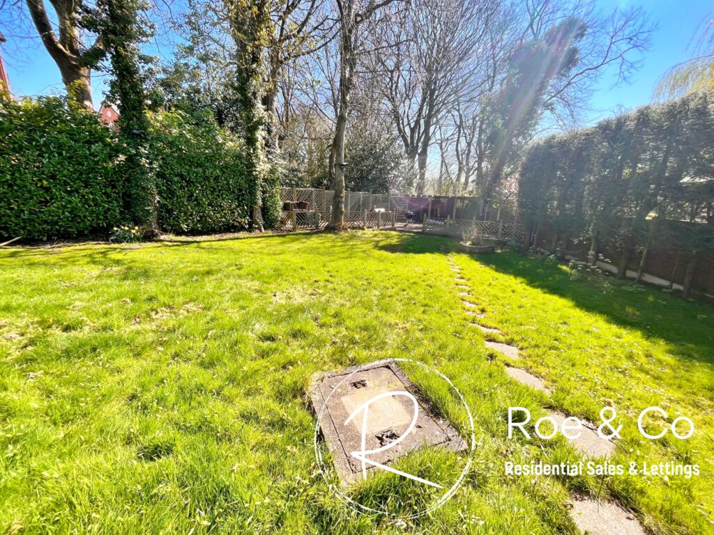 To the front is a large driveway which can accommodate several vehicles, a lawned area which is lined by trees and bushes, offering privacy to the front. To the side of the property there is access to the rear and a bin store area. And to the rear is a vast lawned area & a decked area, both of which have access to outside sockets.