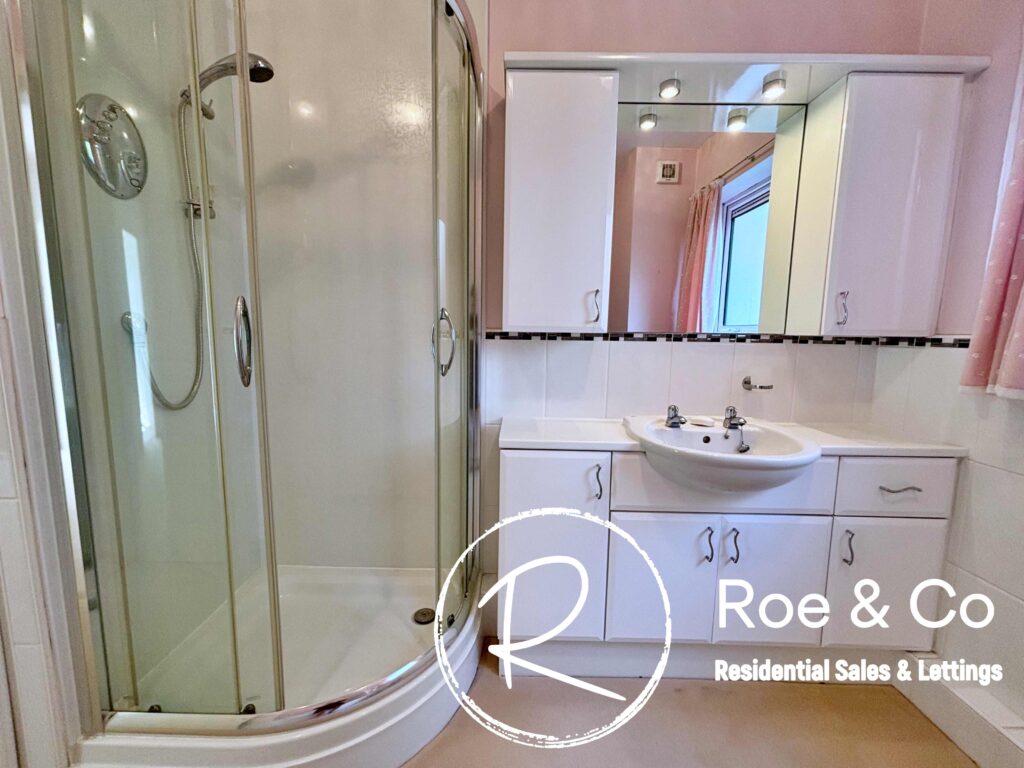 Storage cupboard, corner shower, sink within the vanity unit, bath & w.c.