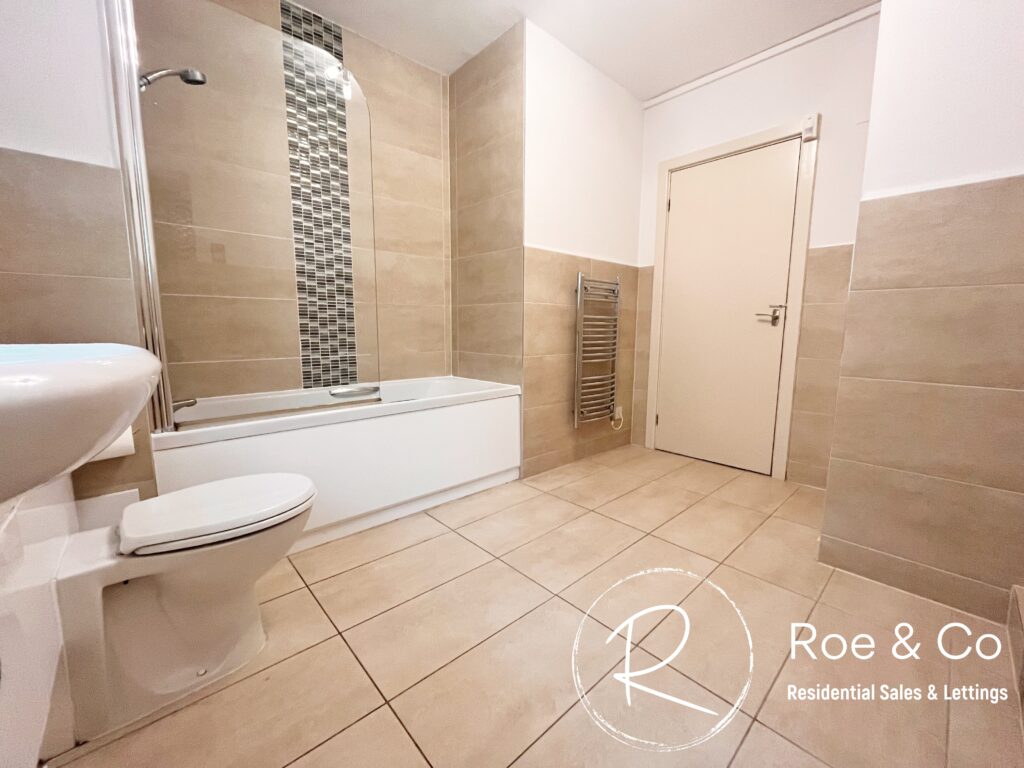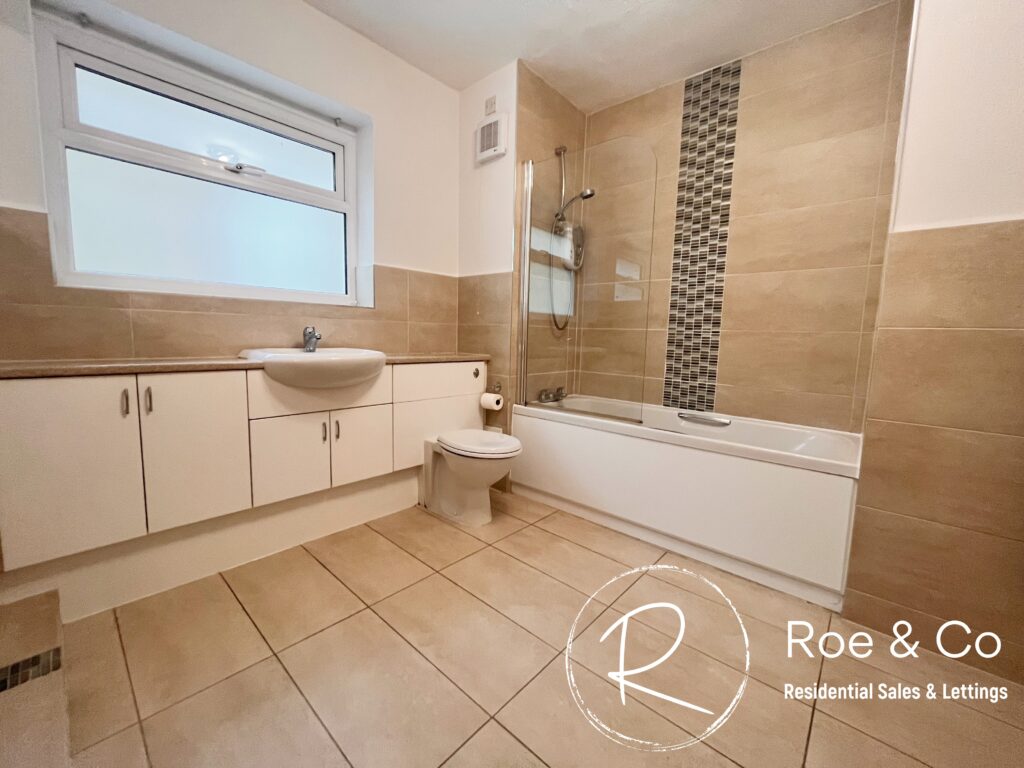 Three piece bathroom suite, housing the water tank which was fitted approx 7 years ago, chrome towel rail. Frosted glass window.
