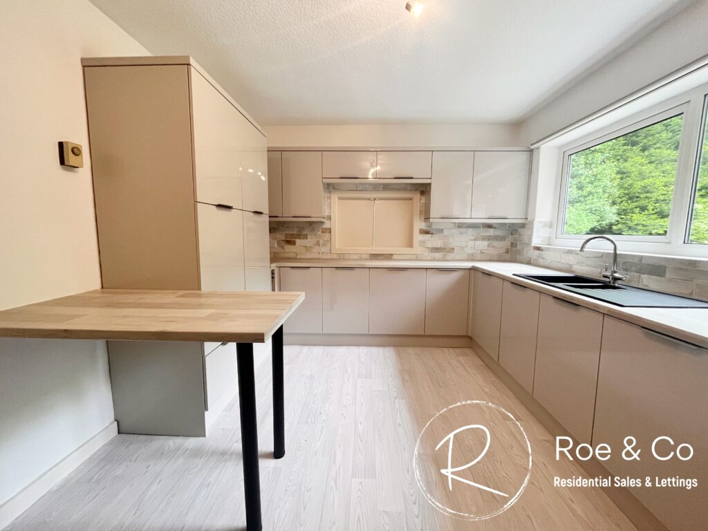 A modern high gloss kitchen with plenty of wall and base units, fitted by Paul Davies kitchens with the following integral appliances, fridge & freezer (separate and at body height to enable you to open with reaching or bending) dishwasher, washing machine, double oven & hob. Breakfast bar to match the worktops and complimentary wall tiles above the base units.