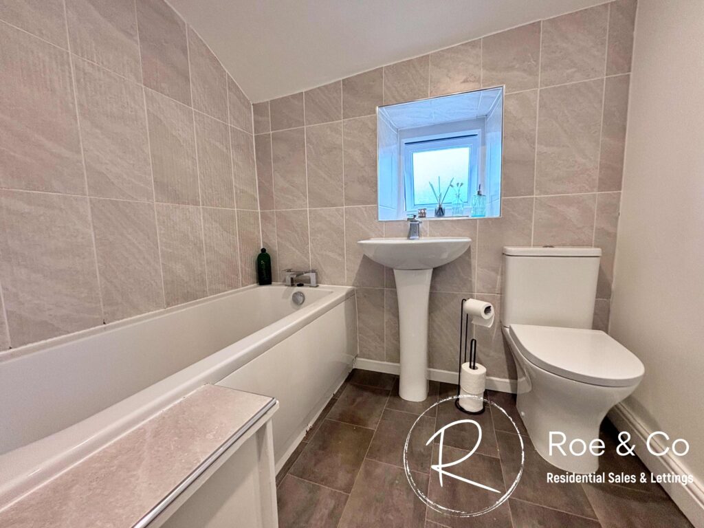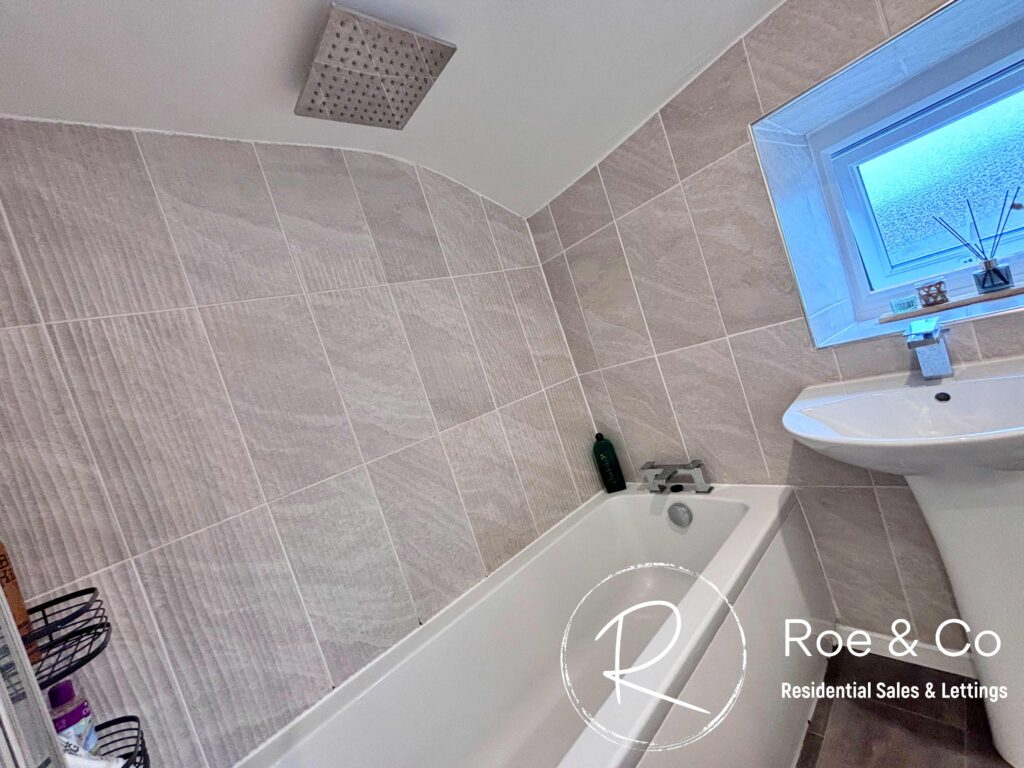 Newly fitted bathroom suite with waterfall shower and fully tiled walls.