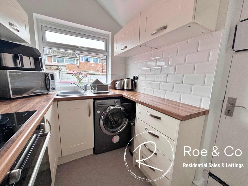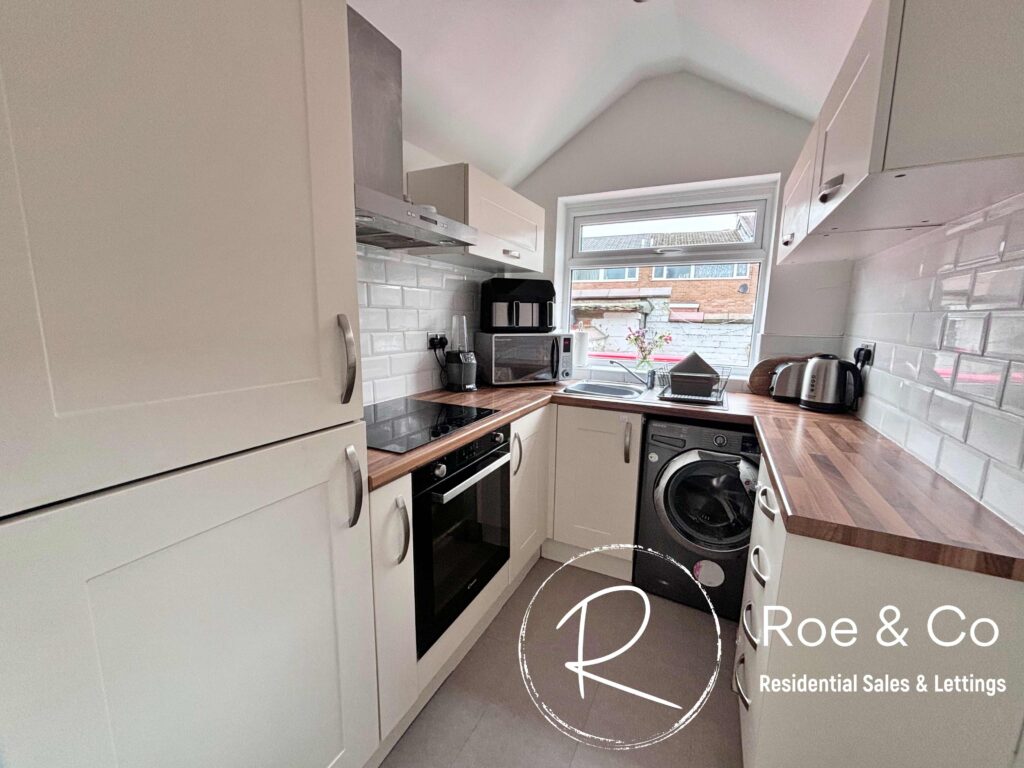Fitted kitchen with integrated fridge/freezer, oven, hob & extractor fan. Space for a washing machine.