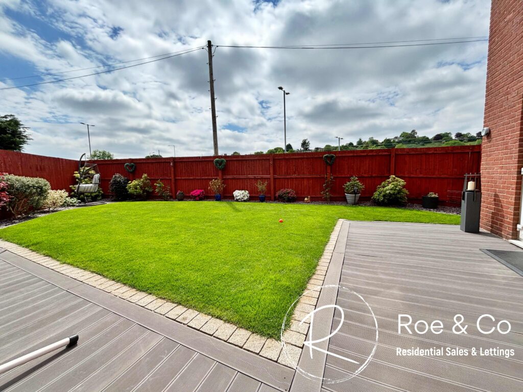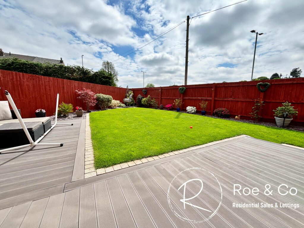 Step outside into the inviting outdoor space and discover the South facing garden located off the living room. This generous garden, complete with composite decking and a lush lawned area, is an oasis for relaxation and entertainment, ideal for both adults and children alike. A pathway from the garden leads to an enclosed yard, offering easy access to the garage for added convenience. Additionally, the property boasts two driveways, one for 3 directly in front of the house and another in front of the garage offering further parking for 1/2 cars.