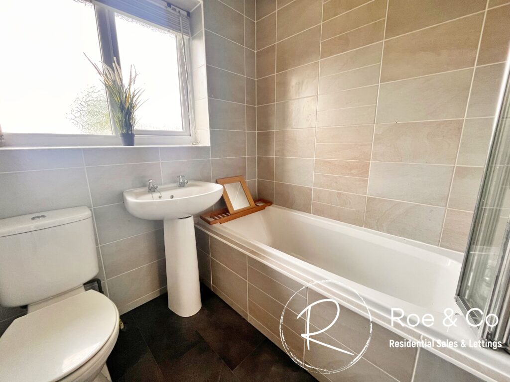 Three piece bathroom suite with overhead shower.