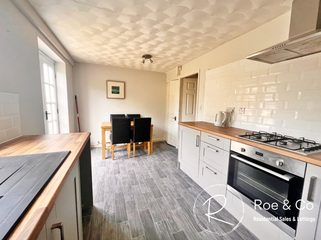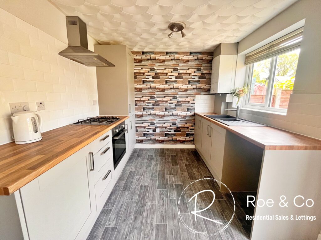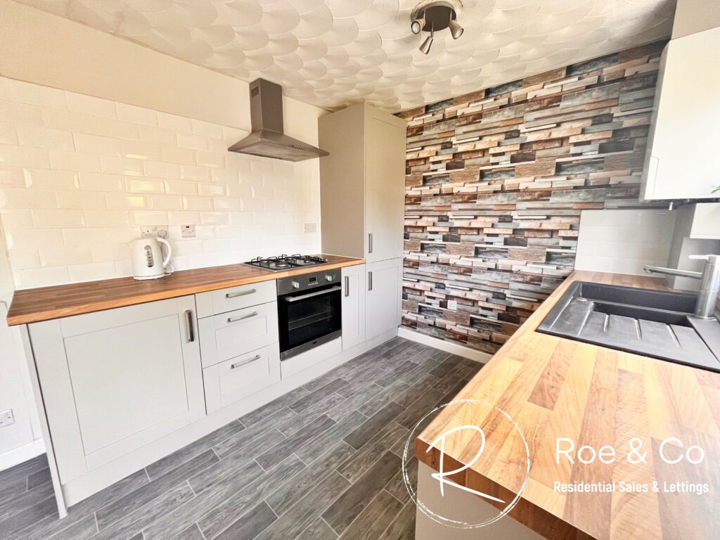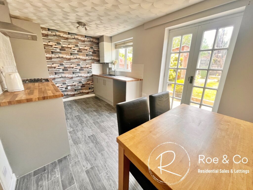 Recently fitted with grey units and wooden effect worktops, integrated oven and hob and a black inset sink. Double doors leading to the rear garden. Understair Storage.