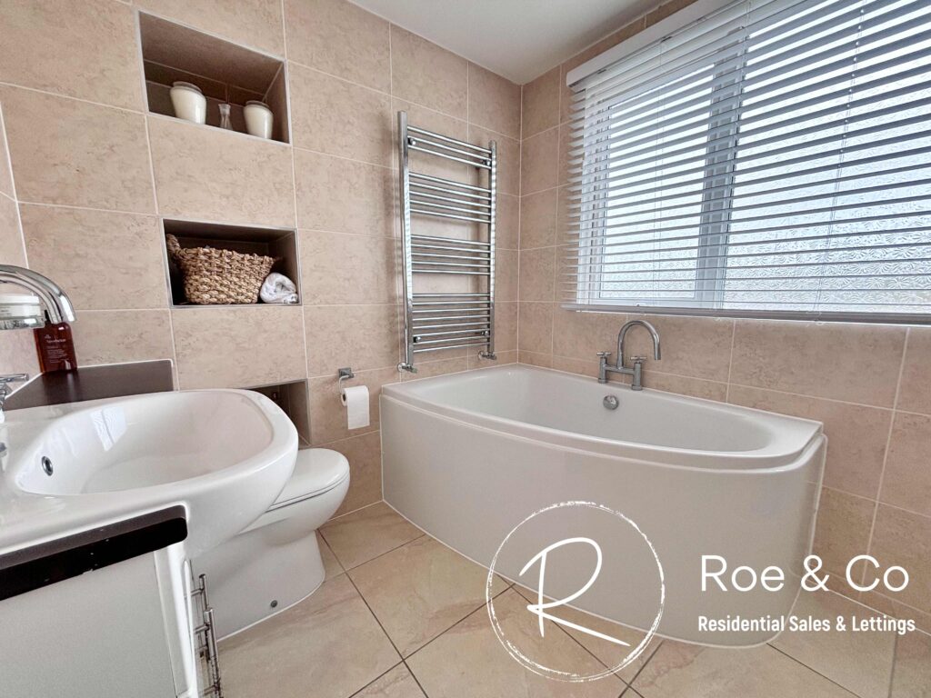 Four piece bathroom suite with corner bath, walk in shower, W.C. & Sink. Chrome towel radiator.