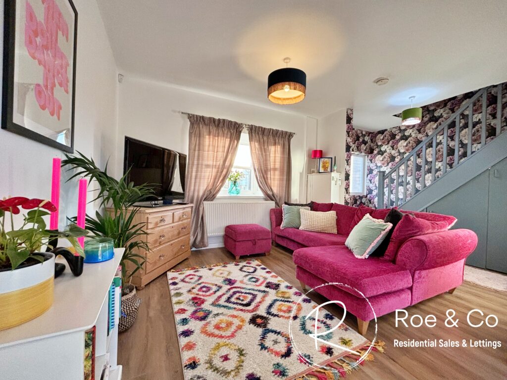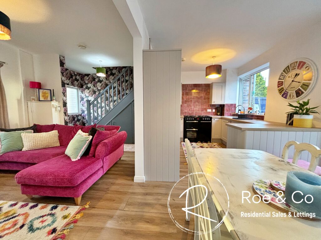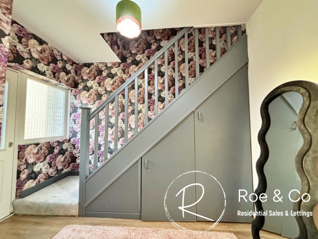 Open plan lounge with a staircase which has had new spindles and professionally spray painted and understair storage cupboards.