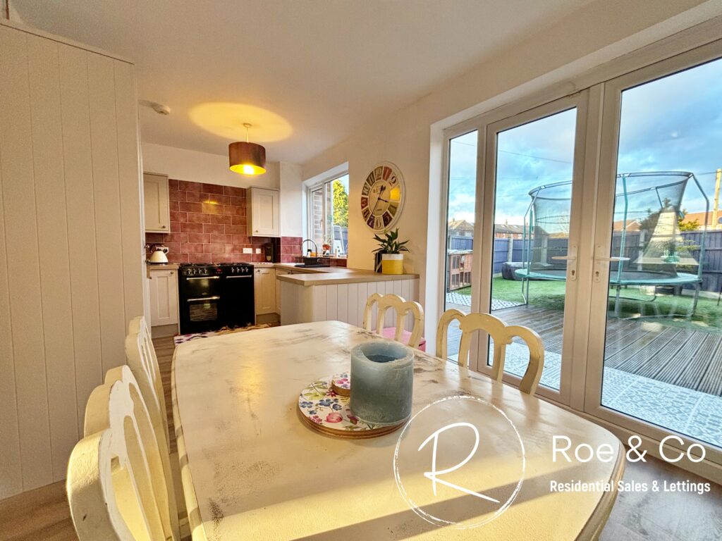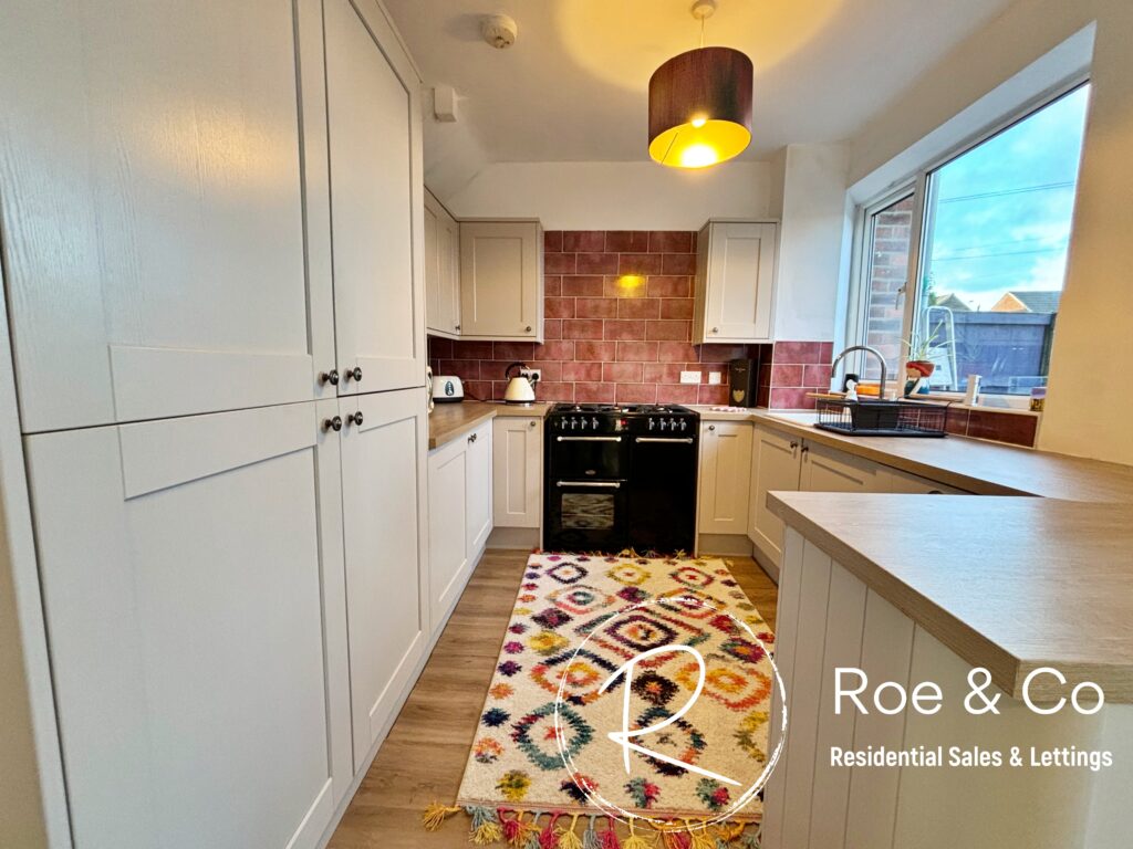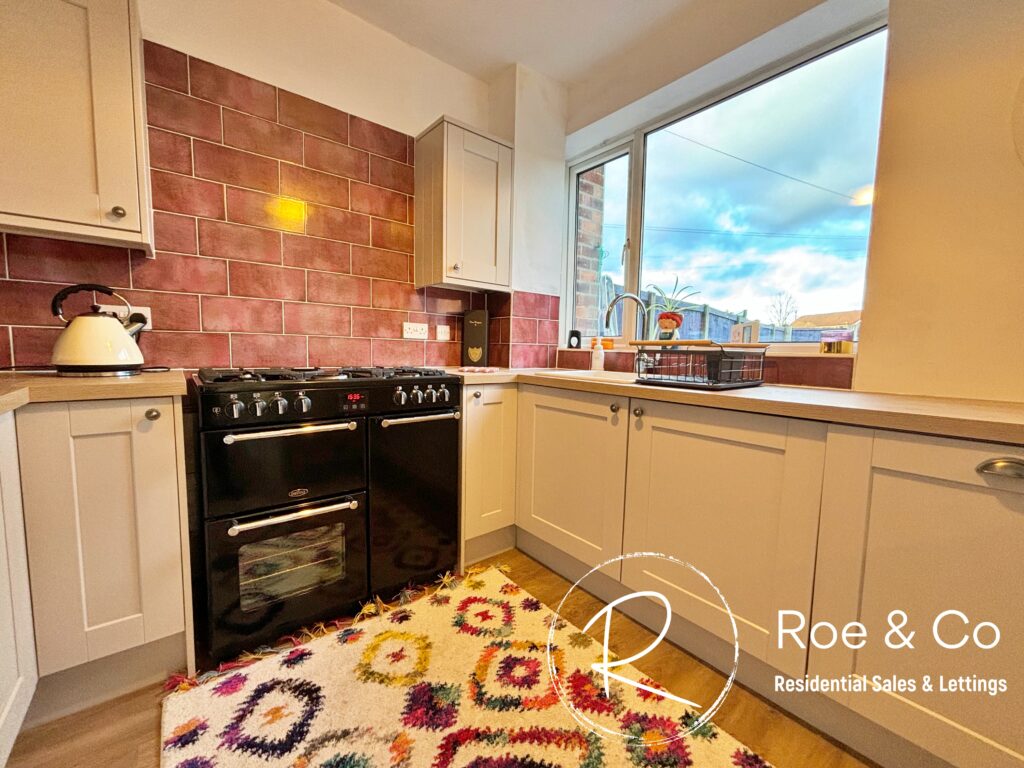 Fully fitted shaker style kitchen which was fitted roughly 5 years ago, integrated dishwasher, washing machine/dryer, fridge & freezer & "Belling" range cooker. Double doors which open onto the rear garden.