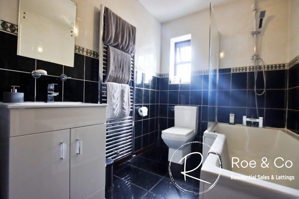 Fitted bathroom suite, with an L shaped bath and overhead shower, W.C. Sink within vanity unit and a chrome towel radiator.