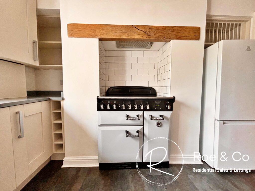 Fully fitted modern shaker style kitchen with integrated dishwasher, washing machine & Rangemaster oven fitted into the recess with vent above.