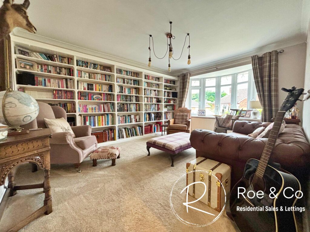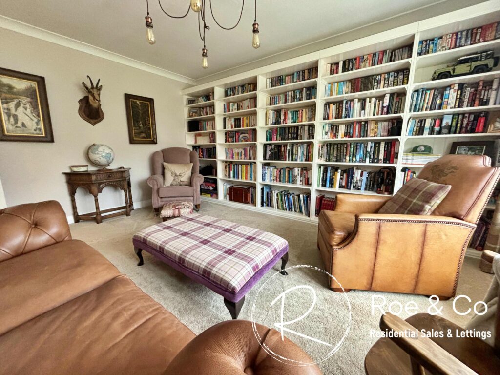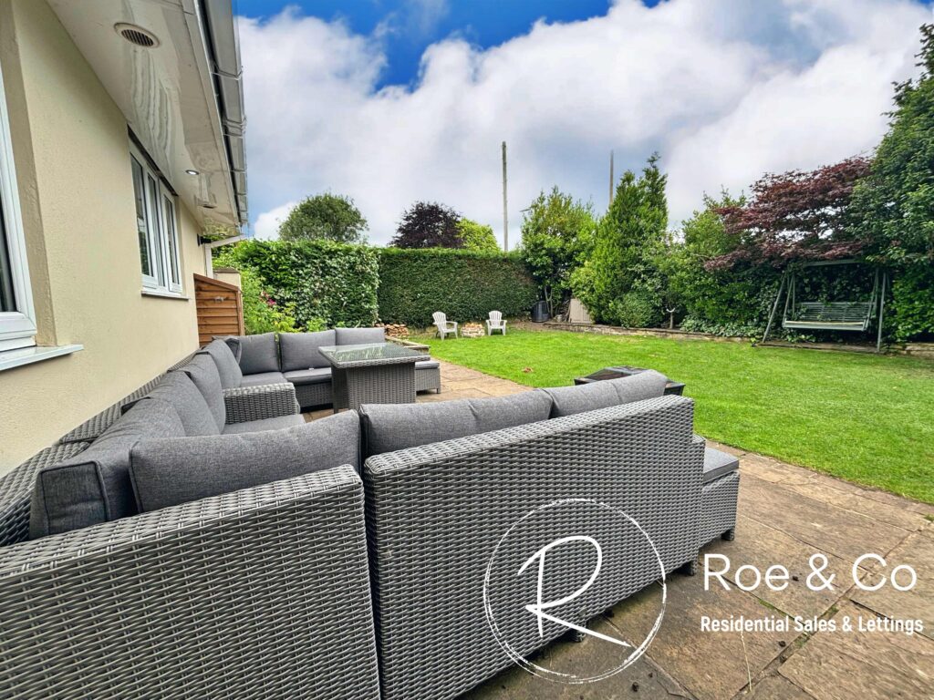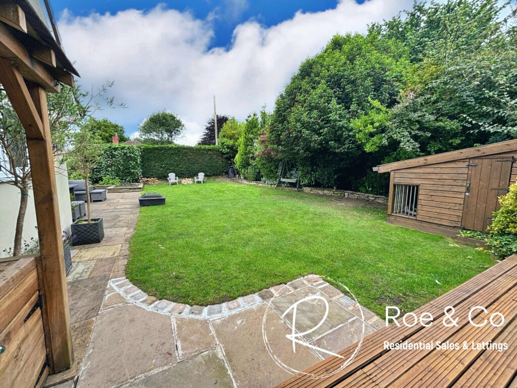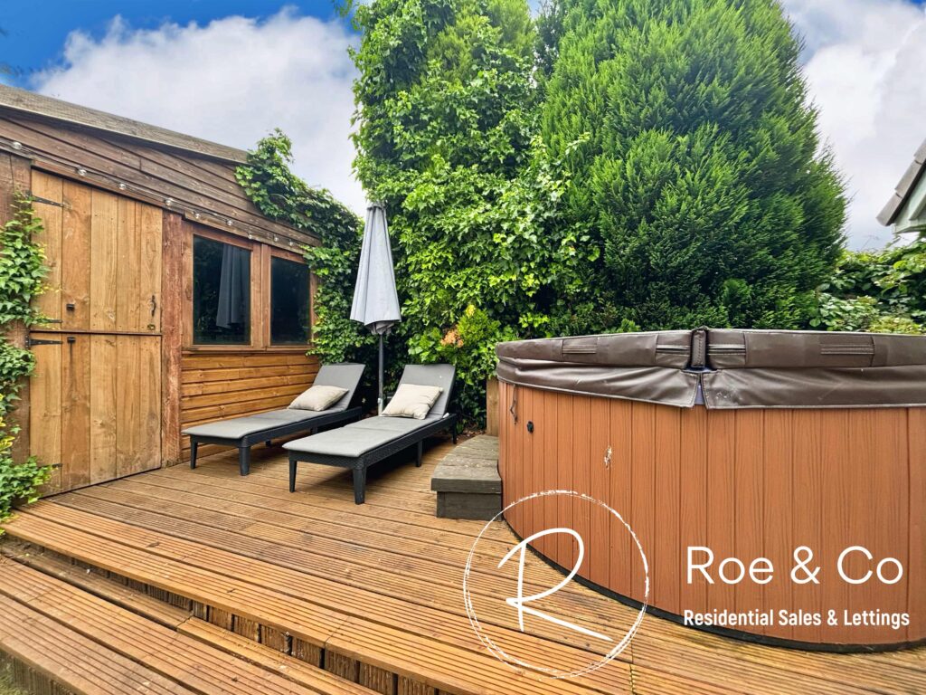 Moving outside, the property boasts a generously sized garden, situated to the side of the house and accessible from the kitchen/family room. Here, a raised decked area awaits, ideal for relaxing in the comfort of a hot tub, while an outdoor wooden shed offers additional storage space. The garden features a large lawned area and a patio extending from the house. Facing West, the garden basks in sunlight from the afternoon well into the evening, creating a serene atmosphere for unwinding after a long day. To complete this picture-perfect setting, a stone driveway provides ample parking space for up to 5 cars, ensuring convenience and ease for you and your guests.