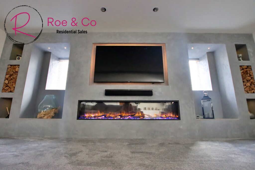 Feature wall with down lighting & insets for ornaments and to feature a wall hung TV, a beautiful electric fireplace, partially tiled flooring and carpeted. Dining Area to the rear by the side of the window.