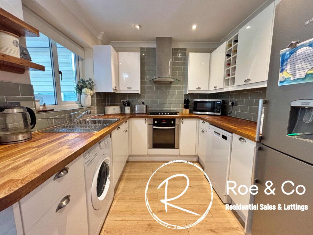 Modern fitted kitchen, space for a washing machine, fridge/freezer, dishwasher & integrated oven, hob & extractor fan