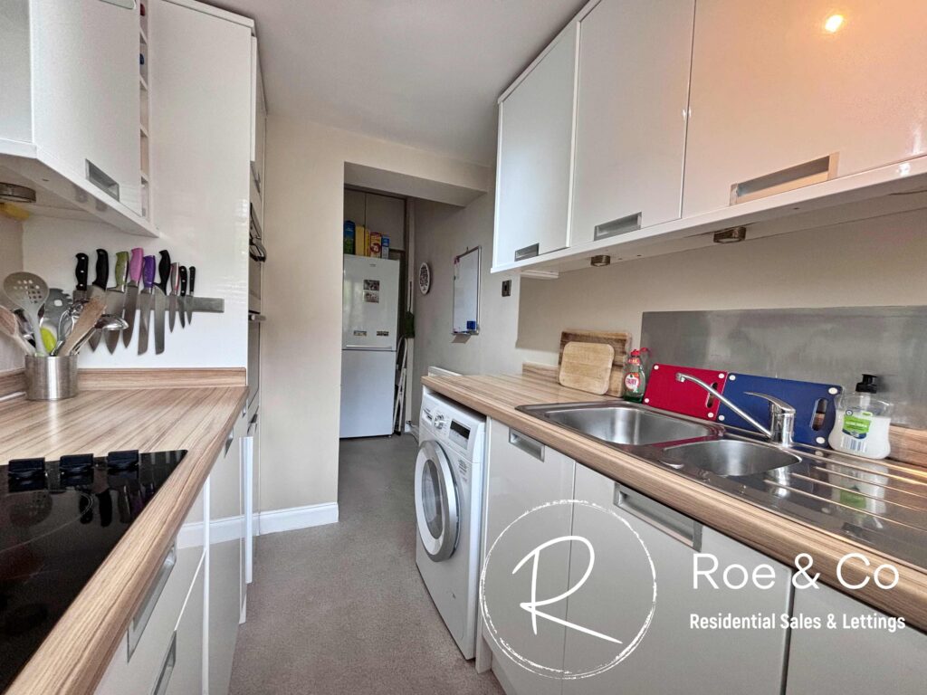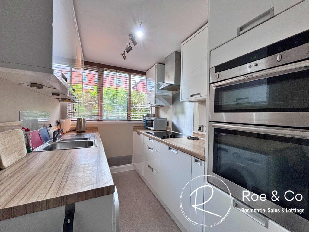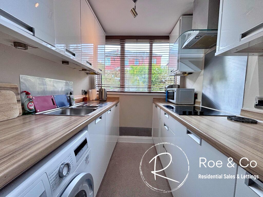 Fitted modern kitchen with integrated double oven, hob & extractor fan, space for a washing machine & fridge/freezer.