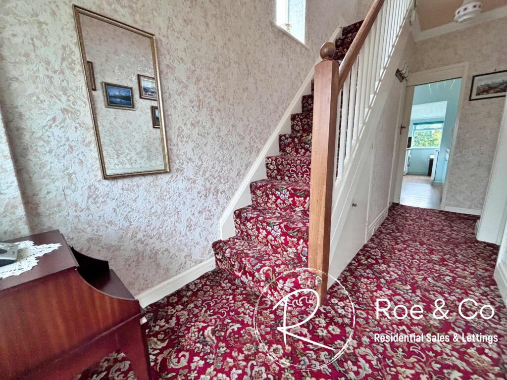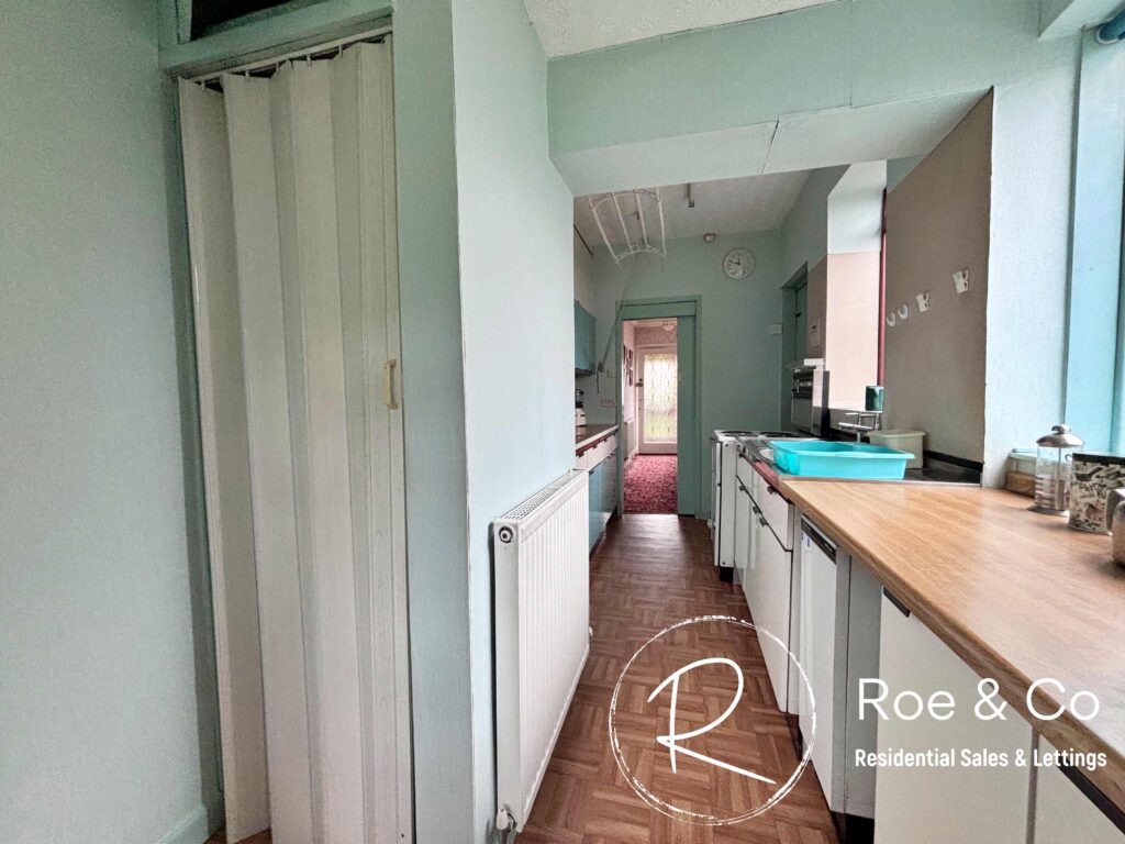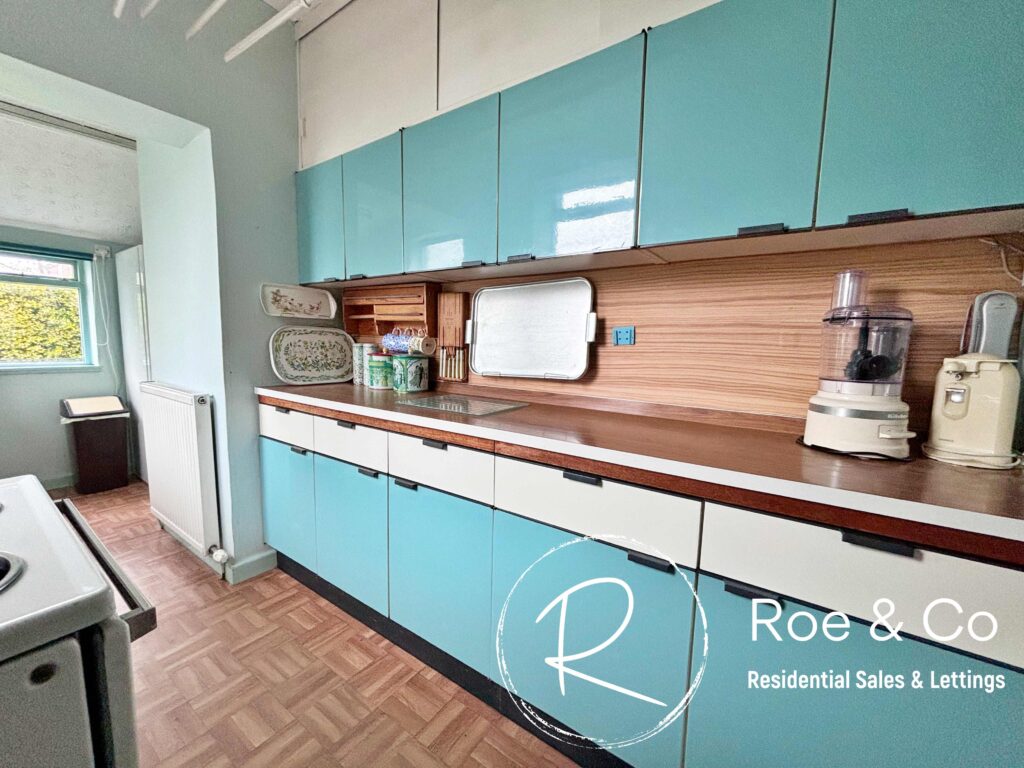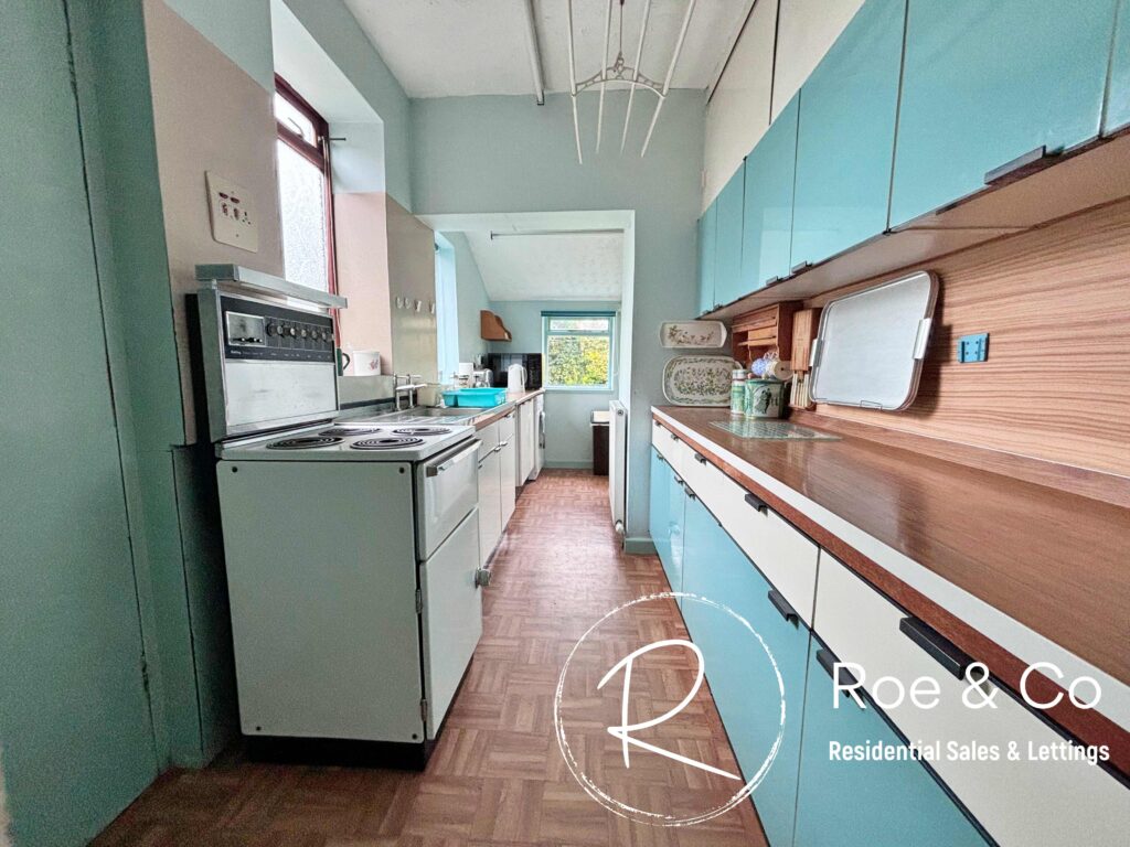 Fitted with an array of wall and base units incorporating double drainer sink. Gas-fired boiler, pantry, freestanding cooker, plumbing for washing machine, and space for fridge/freezer. Door leading to the carport/garage and rear garden. Note some units are to be removed.
