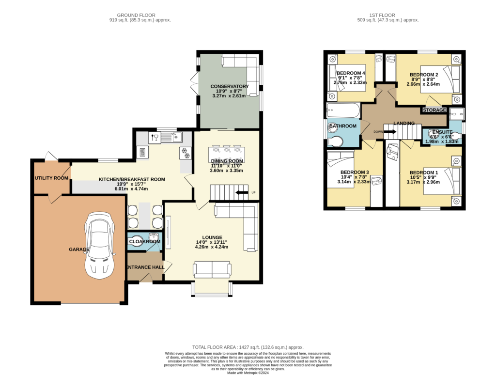 Internally the property has a hall directly off the entrance, where you can access the downstairs W.C. two reception rooms, conservatory & a large open plan kitchen/breakfast room with a utility room located towards the end of the kitchen. The utility room provides direct access to the garage & the garden. To the first floor, the stairs open up onto a light and inviting landing, where each bedroom and the bathroom is accessed from. All bedrooms can accommodate a double bed and currently have fitted wardrobes to provide ample storage. The master bedroom benefits from an en-suite.
